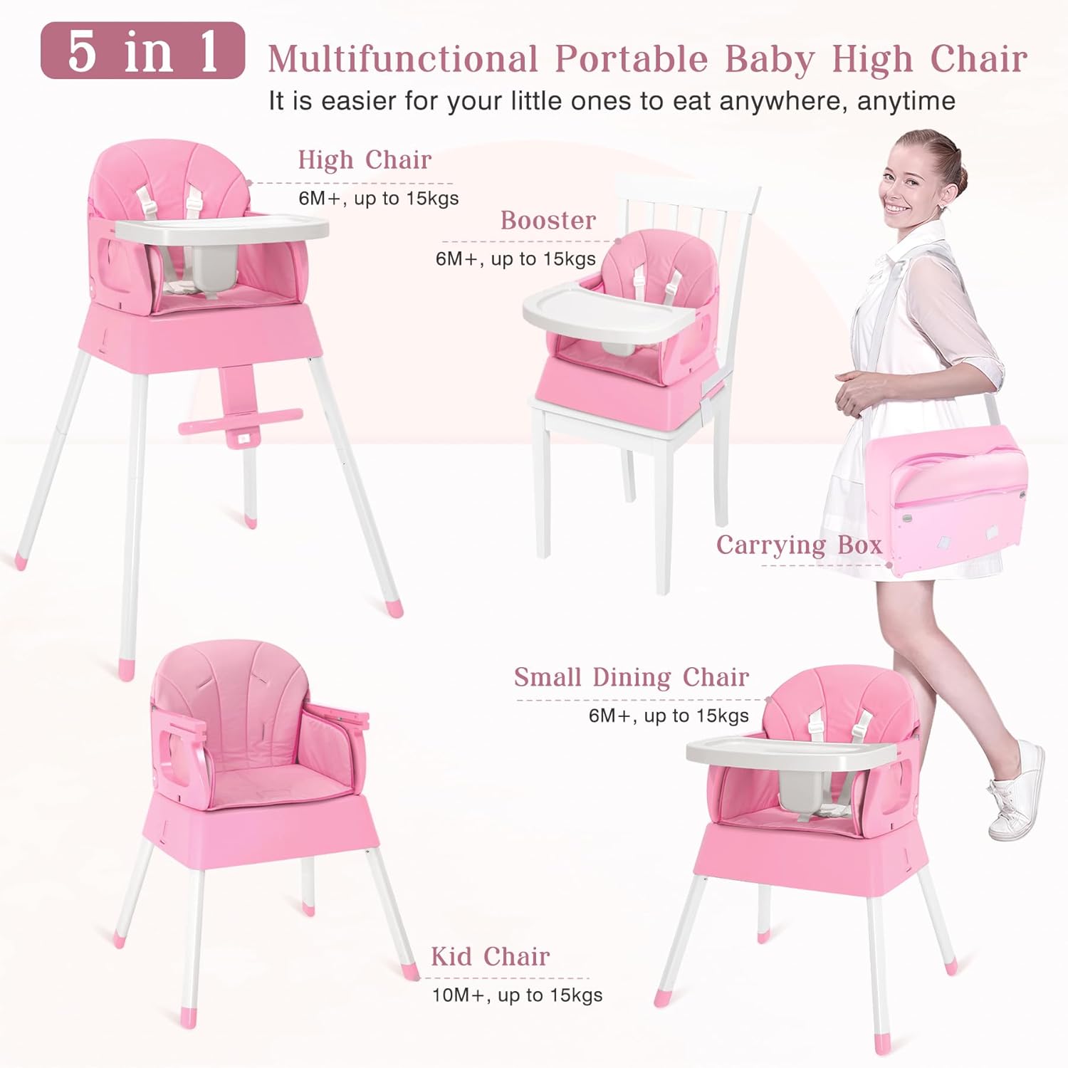 8 reviews for 5 in 1 Foldable Baby High Chair,Convertible Highchair for Babies and Toddlers-Portable Infant Booster Seat,Carry Small Box,Dining Chair,Toddler High Chair with 5-Point Harness,Removable Tray-Pink